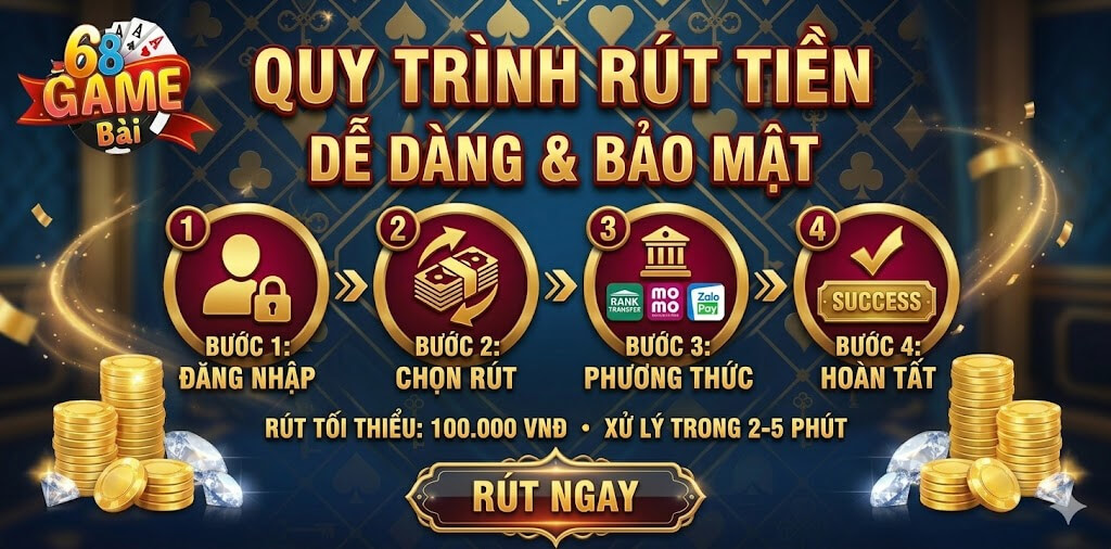 Rút tiền tại 68 Game Bài được đánh giá cao nhờ tốc độ xử lý siêu tốc, chỉ từ 3-10 phút cho mỗi giao dịch. Người chơi có thể linh hoạt rút về tài khoản ngân hàng cá nhân mọi lúc, mọi nơi với sự minh bạch và bảo mật tuyệt đối. Hệ thống tự động hiện đại giúp quy trình xét duyệt diễn ra suôn sẻ, đảm bảo uy tín và quyền lợi tối đa cho mọi thành viên.